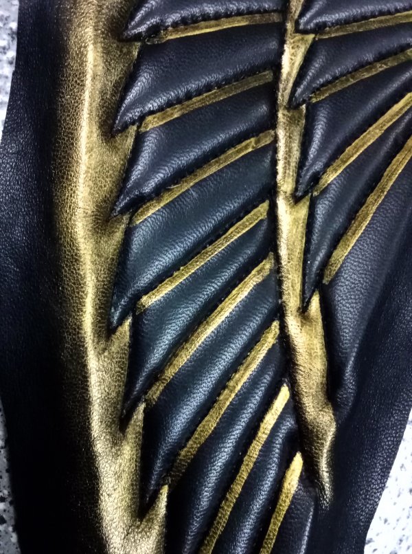 Die Flügelelemente sind mit Leder überzogen, reliefartig abgesteppt und mit goldener Farbe bemalt. Auch andere Teile der Kostüme bestehen aus Leder und sind mit goldenen Rändern verziert.