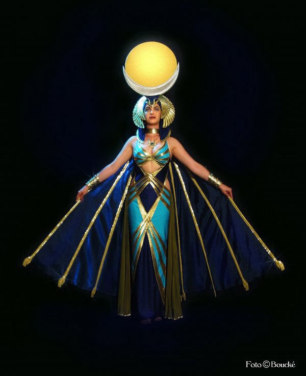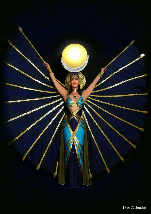 in einem Fantasiekostüm mit altägyptischen Attributen, das sich während