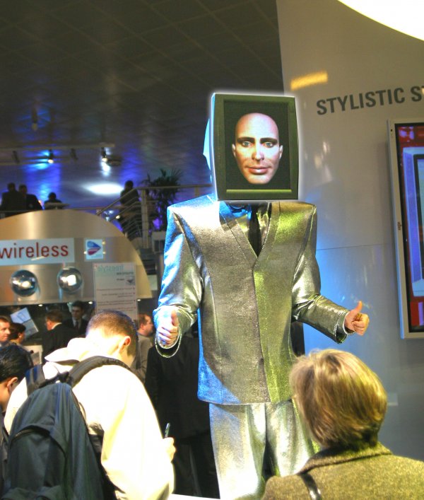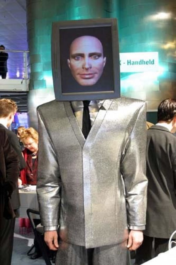 Übergroßer Mann mit virtuellem, interaktivem Monitorgesicht